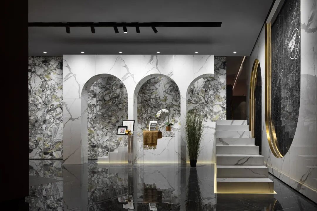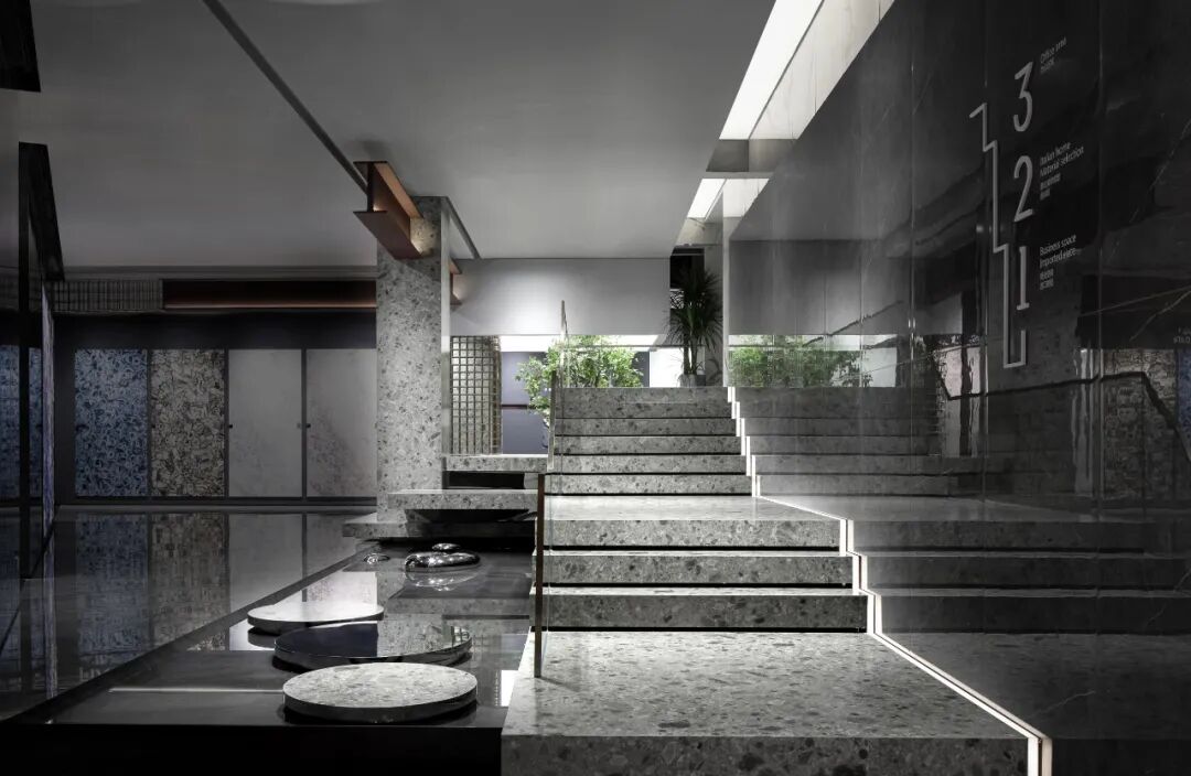 建筑外观是一座四层高的结构体,设计师从生活中喜闻乐见的“魔方”获取创意灵感,将每一层盒子交互旋转,在建筑形态上呈现出看似矛盾又相互依存的扭动形态,凸显建筑体块的力学美感,并使用质朴厚重的深色水泥砖和轻盈通透的玻璃盒子产生强烈的视觉反差,使实体盒子犹如悬浮于空中。黑与白,轻与重,虚与实,运用自由平面与自由立面的设计手法,使外观具有丰富的结构变化,黄铜金属和深灰色水磨石相互穿插,彩色有机玻璃和大理石相互并存,人工合成材质和传统自然材质相辅相成,宛若光束划破冷峻夜空,表达了品牌的轻奢调性、极致工艺和美学观点。室内空间将旋转的“魔方”概念继续延伸,使空间形态更具自由对立特征,大堂空间天花运用水纹不锈钢材质,仿佛置身水底的观感,转动的墙面和天花通过体块搭接和穿插,赋予空间强烈的建筑体块属性。粉色奢石和水泥质感的地面相互对比,凸显各自的质感特点,空间起承转折,一步一景,让观者的视线的行走方式被空间吸引着前行,自由空间的核心不应该限制人的行为,而是自然引导人在空间中行走,穿行于水波潋滟中,诗意的传达以建筑的方式发展到一种与自然之物心灵唱和的更复杂、更精致的状态。大面积落地玻璃窗将自然光引进空间,提高整体空间的氛围感,金属的回旋似乎源于水的漩涡,石头的锯齿可能来自木匠的榫卯,但它不是漩涡,也不是榫卯。一种特质、一种韵律,把表现的与被表现的联系起来,而这种联系又只体现为单纯的形式语言。这是一种诗意的抽象。形状不再带有任何内涵或延伸的意义,它只代表它本身,它只代表美。以水磨石质感的阶梯通过建筑手段营造使其漂浮于水面之上,这种看似违背自然规律的方式将引发更多联想,由石块构建成的台阶,引领观者缓步而上,犹如通往未知世界的天梯,分离的体块,体块之间的缝隙,缝隙之间的光带,让厚重的台阶变得轻盈起来,意大利建筑大师斯卡帕认为每一个形体都应该是独立而又相互关联的,由此而衍生出“分离主义”的建筑观点,这些来自建筑界的理论无疑影响到了空间设计领域。柯布的自由立面理论摆脱了结构柱对建筑立面的限制,同时也认为建筑结构不应该被掩饰起来,它们在空间里本身就具有独立美感,设计师在此空间不但保留结构的原始美感,甚至去强化这种建筑结构本身的美感,裸露的工字钢结构和钢筋网架在梁柱之间自然穿插,间架结构的组合中亦虚亦实,表达出对工业时代的建筑架构形态的赞美。让外露的建筑结构自带的美感成为空间中的装饰元素,让体块和线条在上下左右的多元向度里,拉出立体层次感。设计师在此共享空间中置入4米高的LED旋转屏幕模块,放大自然石纹的肌理和色彩魅力,用于呈现产品本质的视觉观感。水滴形的不锈钢艺术装置慵懒地匍匐在地上,如梦游者般的沉重、缓慢、游离…..自然景观半掩于盒子里,给空间增添不少生动,设计团队把自然的事物转变为某种建筑和城市的构建元素,引人无限遐想。一个空间中三个不同形态的柱子,似乎是在向观者逐层剥开建筑的外在包裹物,形成强烈的视觉冲击感,引人陷入哲思,真正的完美是什么?强调不同材料特征之间的碰撞,打磨抛光的水磨石、精致奢华的大理石、腐蚀生锈的工字钢金属,光滑与粗糙,冷峻与温润,用对比、类推、共生、重复、秩序等方式来构成空间。中部的柱子用金属结构、铝材、玻璃等技术结合起来构筑成了一种新的建筑结构元素和视觉元素,这种组合既是对可持续材料的探索也是对现代主义的承袭,设计不单单是一种表面装饰,更是要发掘和思考各种内在可能性带来的重构。交接是装饰之源。斯卡帕考虑的不仅是平面的交接,而是立体的、结构的交接。交接发生在不同功能、不同部件、不同材料之间,优美的交接细部设计表现出它们之间优美的关系。这种优美的关系便是清晰。拱形门既是西方也是东方的建筑语言,利用向上的拱形与向下的拱形并置,产生东西美学的共鸣和冲撞,同时又被赋予产品的展示功能;巧妙地运用透明亚克力板这种现代材料与古老的原始的石材形态进行组合,瓷质台阶从拱形里延伸出来。这种拱形的形态来源于过去的历史建筑元素,却运用现代抽象的设计语言与最基础的建筑形态来表达,使之抽出、混合、拼接。室内空间是建筑的延伸,挑空的阳台和落地玻璃窗为室内空间提供了必要的空间属性,抬高的阳台,园林氛围的书房,宁静自然的卧室,这里是一方享受自然阳光的天地。阳台上枫树,阳光透过金黄的叶子撒进室内,犹如在讲述着一个秋天的浪漫童话,更似乎是朱丽叶的窗台,窗台的绿植和户外的自然景观形成一个很美的过渡空间,设计师刻意营造出一种转角一霎那遇见自然的惊喜,试图重启一种人与建筑融入自然事物的“齐物”建筑观。光影在树叶的间隙中流动,在室内留下自己的叙事语言。用虚拟手段打造的苏州园林白墙和山影打破了这静穆,使封闭空间变得通透和悠然自得,塑造出一种羽毛般轻盈的空间质感。空间的本质是回归自然,混凝土质感的产品在光线的渲染下更显宁静本色,质朴的空间氛围使观者的内心抛去浮躁,回归宁静,延续了一楼的设计元素,上下层互相呼应。用最自在的方式,诠释最纯净的白色。项目名称:意大利I.T CERAMICHE总部展厅设计团队:卢仲文、李念华、邱文峰、兰菁薇、吕杰超、冼柳青、